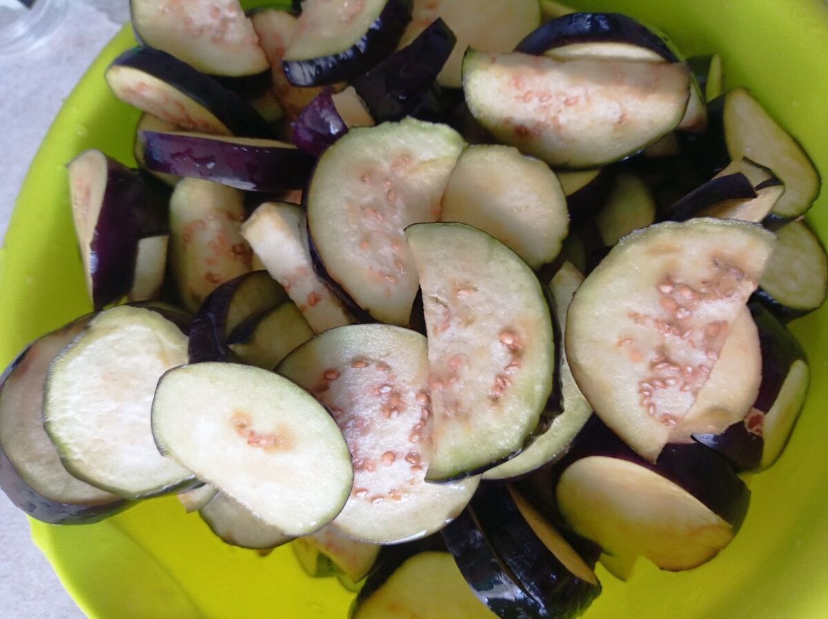 После закипания даю покипеть 10 минут на слабом огне и добавляю баклажаны резанные кружочками или полукругом, если они крупные. Предварительно баклажаны нарезав засыпала солью и дала постоять 10 минут. Затем хорошо промыла водой и отправляю в кастрюлю.