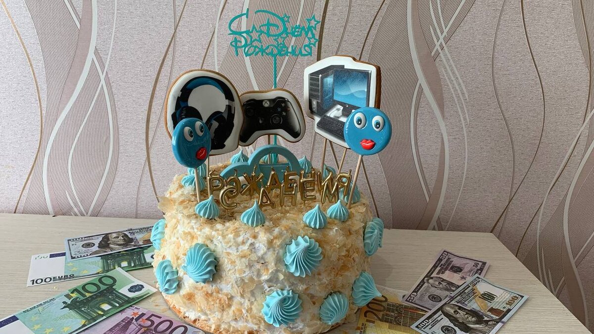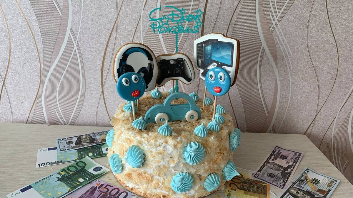 И вот торт такой заказали в этот раз-слоёное тесто, крем-чиз, абрикосовая прослойка и грецкие орехи. А декор тортика это сюрприз для именинника, всё то, чем он увлекается, а также чего ему желают родные и близкие.