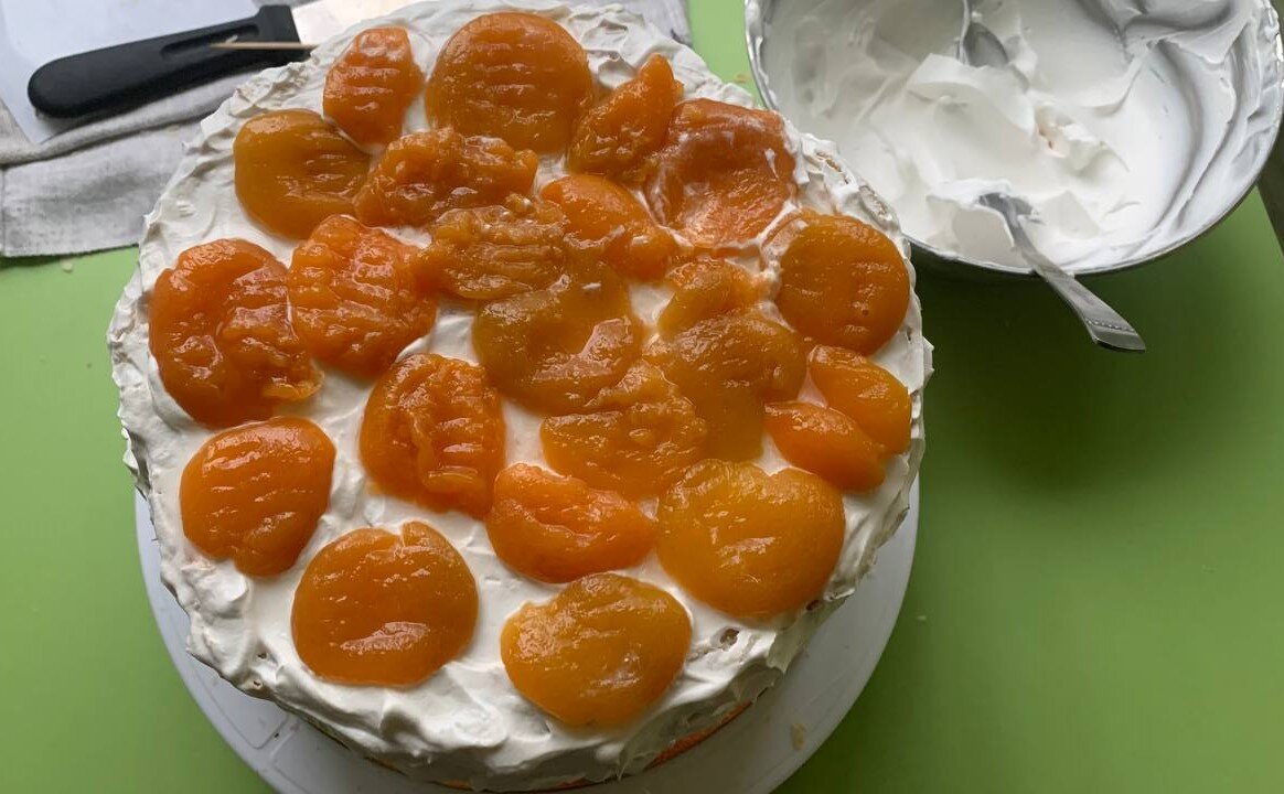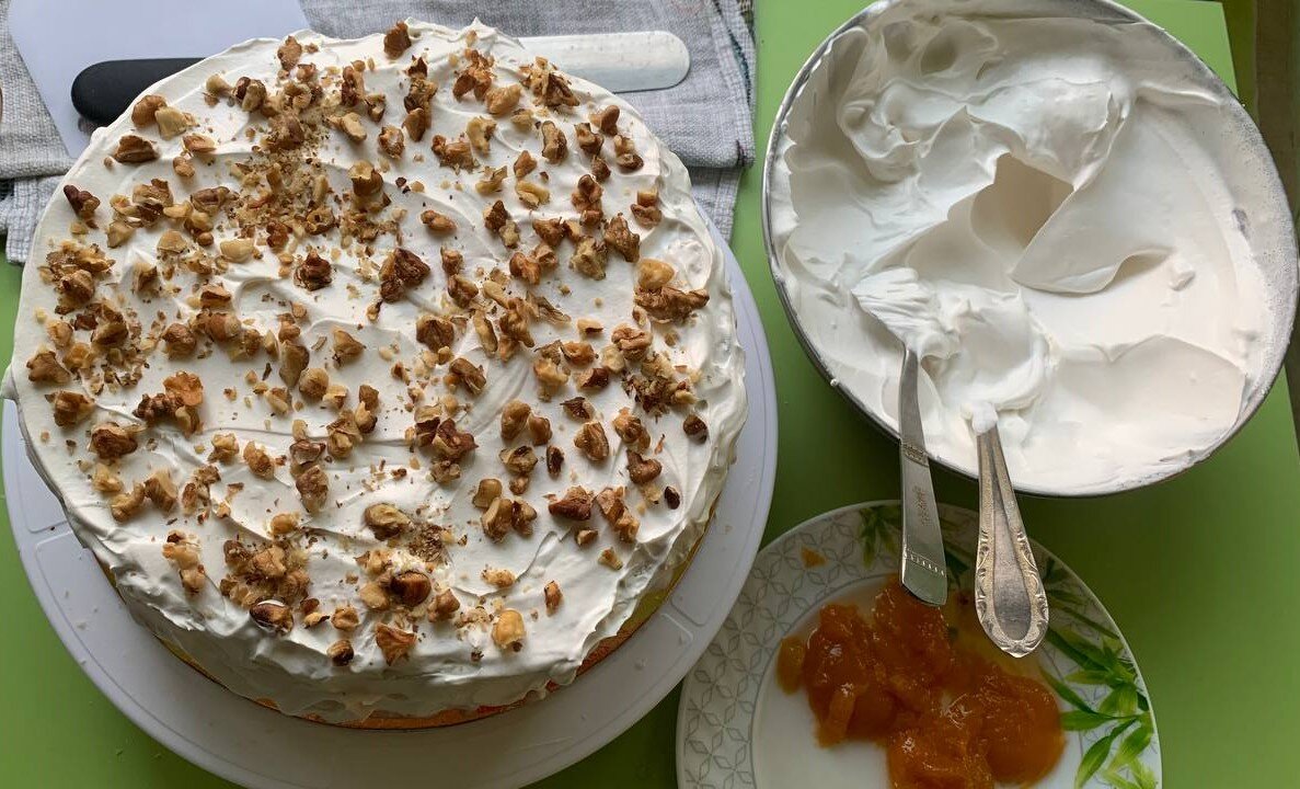 Коржи пропитала сиропом в котором были абрикосы. Хорошо для начинки торта такого идут консервированные персики или абрикосы. Грецкие орехи слегка поджарила на сухой сковороде.