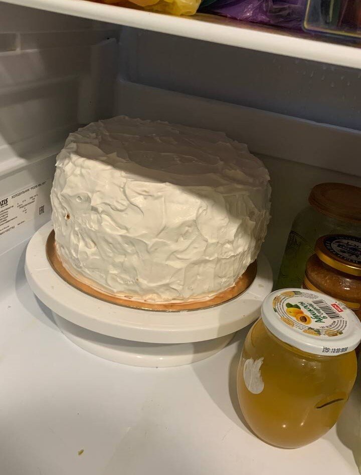 Торт получился высокий, пришлось временно убрать нижнюю полку в холодильнике, так как тортик отправлялся на ночь пропитаться.